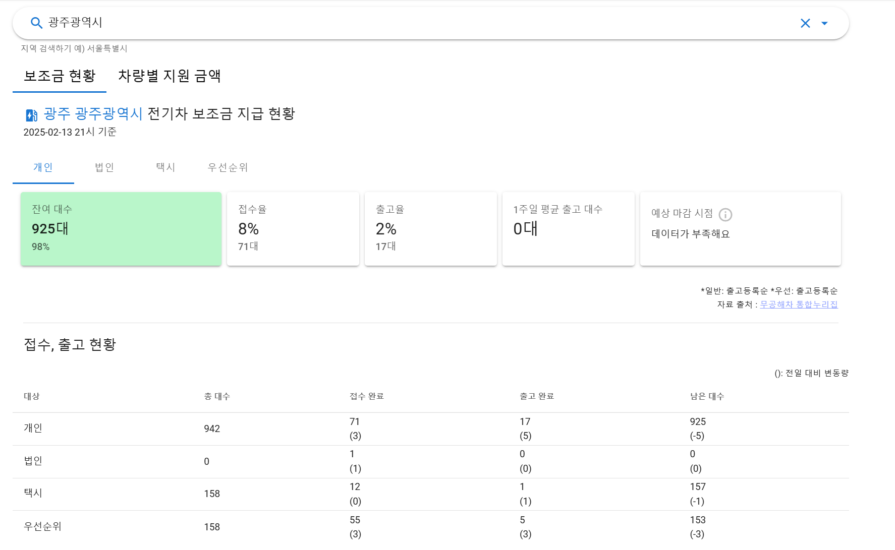 아래 사이트에서 지역별 전기차 보조금 예산 잔액을 확인하시고, 예산 소진 전에 차량 구매를 통하여 예산을 지원받으시기 바랍니다.